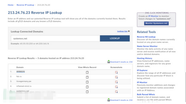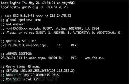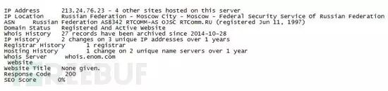 “昨天在检查Carbanak报告中的攻击指示器(indicators of compromise,IOC)数据时,我发现systemsvc.net这个域名(报告中提到的C&C域名)现在解析到的IP是213.24.76.23。我检查相关信息时发现IP在ASN AS8342 RTCOMM-AS OJSC RTComm.RU名下,地理位置是莫斯科 –莫斯科 –俄罗斯联邦安全局。”Goncharov在博文中写道,“我不知道到底怎么回事,我并不认为联邦安全局会把一个跟Carbanak有关的域名指向安全局的IP上。可能是域名的拥有者在恶作剧。”