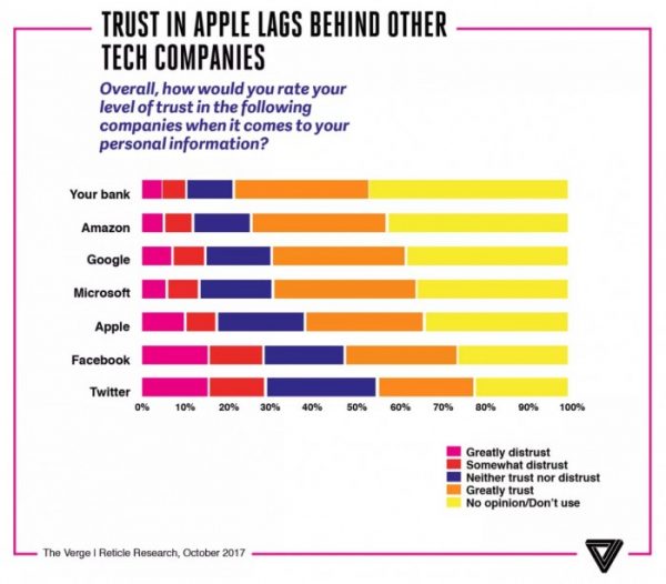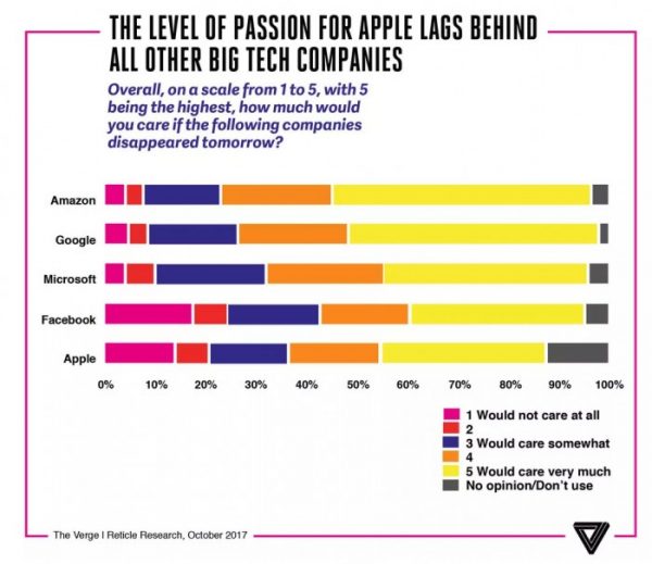 苹果公司备受追捧的时代可能即将结束。近期,一份最新调查显示,在激发消费者热情和信任度上,苹果和亚马逊公司、谷歌公司、微软公司、Facebook 公司相比并不占优,甚至还垫底。科技博客 The Verge 和咨询公司 Reticle Research 在 9 月 28 日至 10 月 10 日联合做了一次调查,受访者包括 1520 名美国全国代表(根据美国 2016 年人口普查)。结果显示,尽管苹果在科技行业依旧拥有庞大影响力,但并未在消费者心中留下更为正面的印象,在某些情况下甚至很负面。